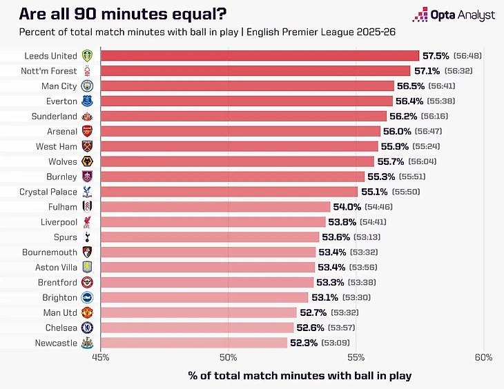 Мяч находится в игре в среднем лишь 54,7% времени матчей Премьер-лиги в этом сезоне; при этом самый низкий показатель за последние 10 полных сезонов составлял 55,7% — и это было в 2022/23.