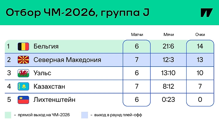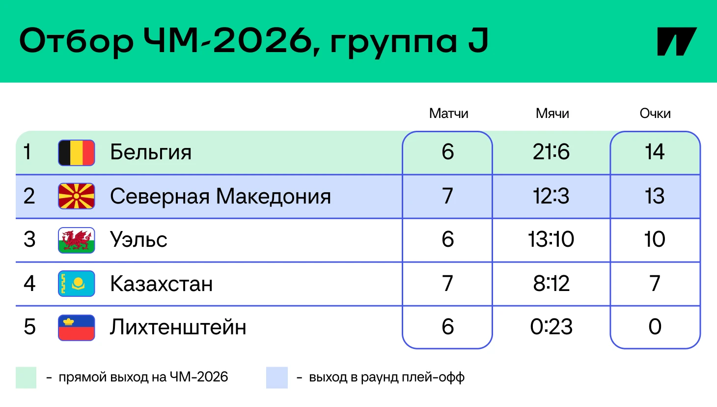 После шести игр Северная Македония лидировала с 12 очками, после пяти следом шли Бельгия (11 очков) и Уэльс (10). У Казахстана – шесть очков после шести матчей, у Лихтенштейна – ни одного.