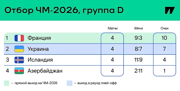 По итогам трех туров Франция набрала девять очков, Украина – четыре, Исландия – три, Азербайджан – одно.