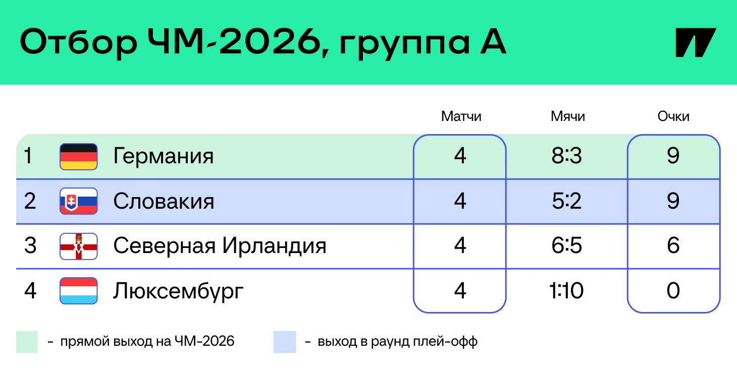 Немцы не пропустили на выезде впервые с весны 2024-го, когда победили Францию, хотя хозяева били даже чаще их (12:10). А еще Германия выиграла 11-й подряд матч у североирландцев.