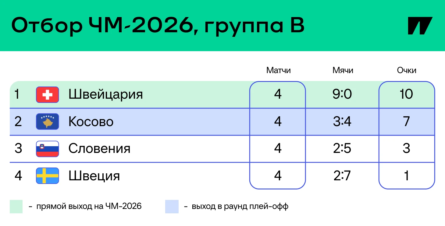 В ноябре пройдут оставшиеся два тура. 15-го Швейцария сыграет дома со Швецией, а Словения – с Косово. 18-го состоятся матчи Швеция – Словения и Косово – Швейцария.