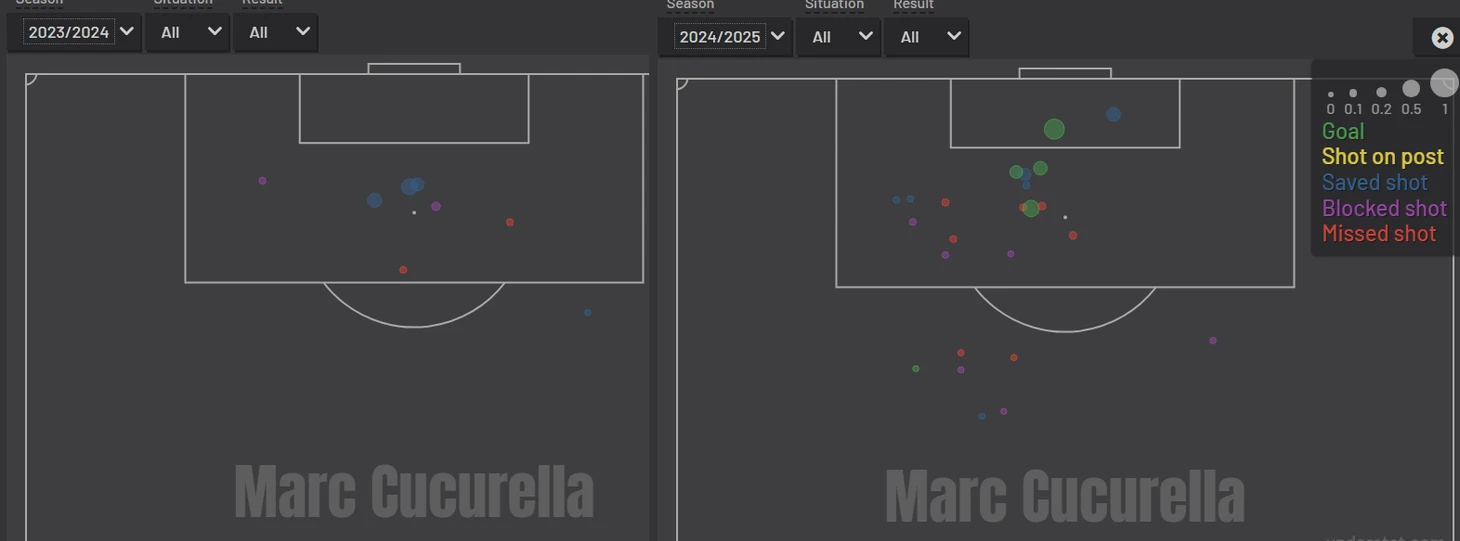 По ходу сезона Марк явно прибавил завершении атака — стал чаще забивать и бить по воротам. В АПЛ сезона 24/25 Кукурелья набрал 5+1 по системе гол+пас, при 4.82 xG и 4.45 xA, а в целом за сезон у Марка 7+4. Наглядно, сравнение карты ударов Кукурельи в сезонах 23/24 и 24/25.