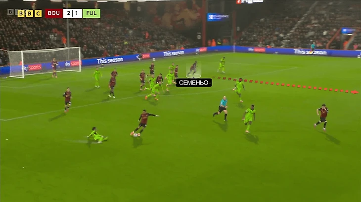 В-третьих, Семеньо может закончить атаку голом, даже если начал эпизод у своей штрафной. Удивительная выносливость. «Борнмут» пользуется ей, когда нужно передохнуть после прессинга или защитить результат.