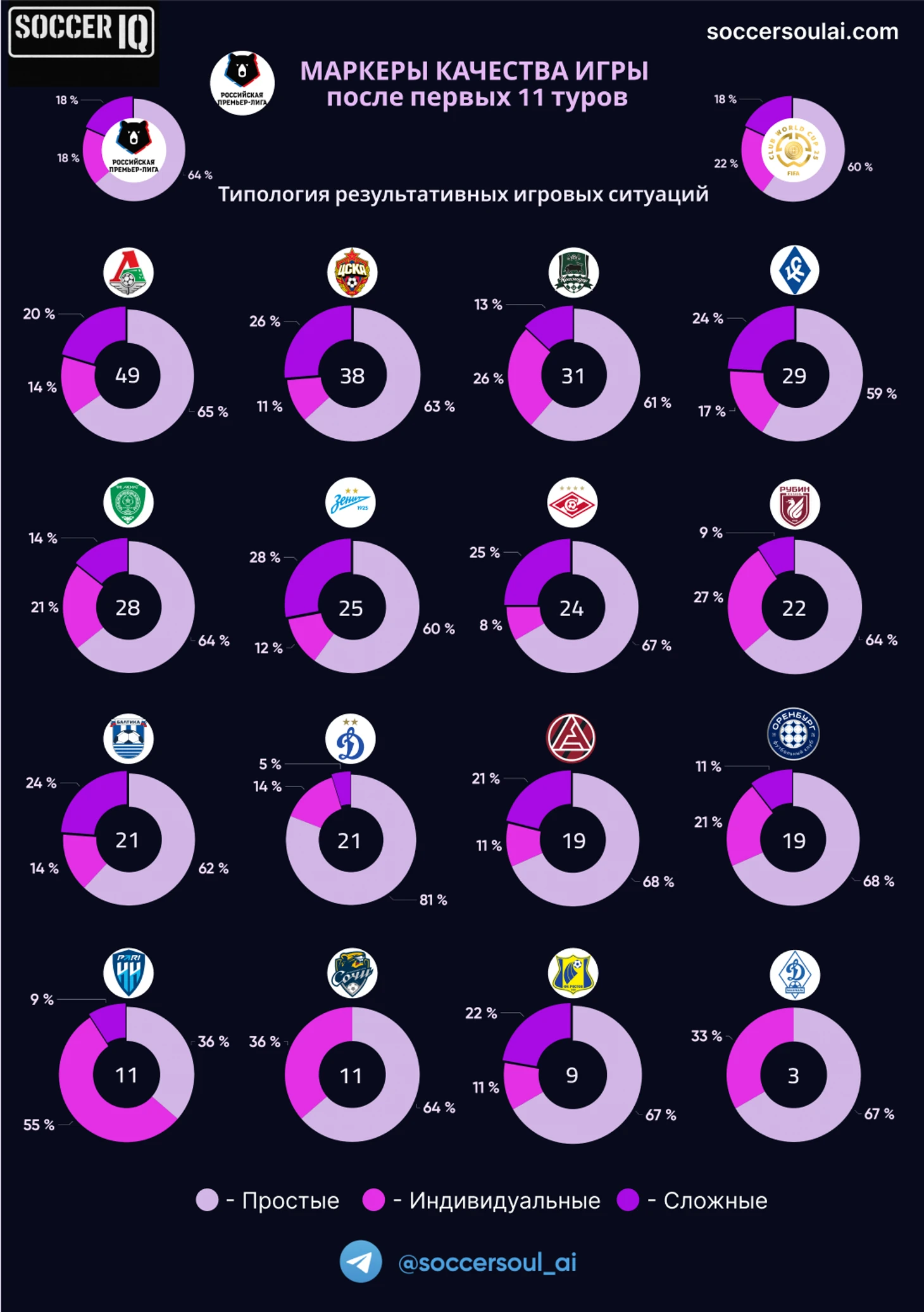 Зенит и ЦСКА – лучшие в лиге по доле сложных ситуаций (26%). При этом армейцы (в компании с Локо) лидируют и с точки зрения их количества (по 10). По доле индивидуальных впереди остальных Пари НН (55%) и Сочи (36%), но это лидерство сложно отнести командам в плюс, поскольку отображает проблемы с коллективными результативными действиями на фоне того, что в сумме результативных ситуаций у этих команд совсем не много.