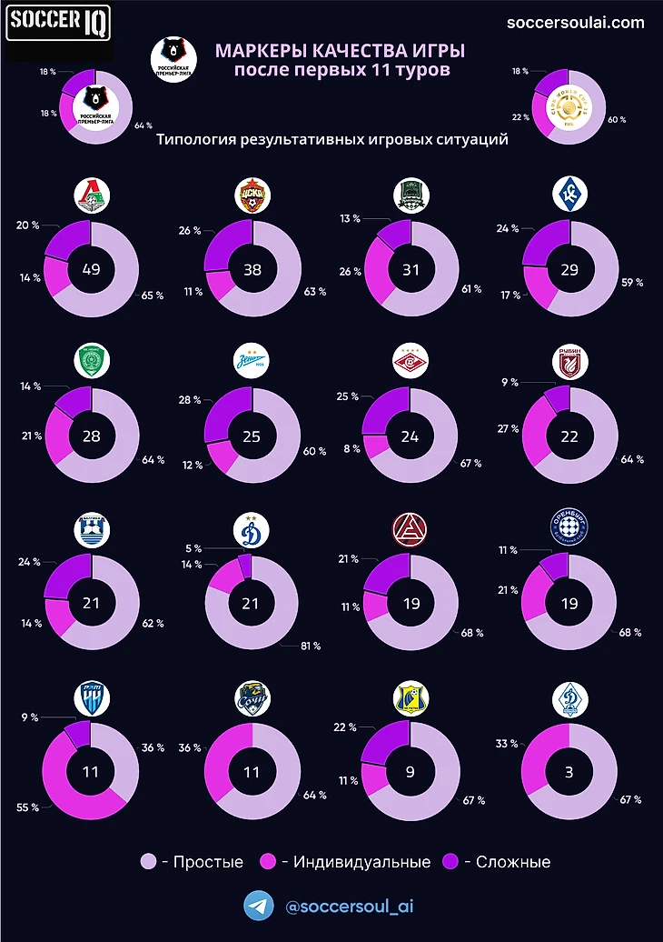 В части типологии голевых ситуаций, общий показатель лиги близок к классическому распределению, с меньшей эффективностью индивидуальных и большей эффективностью простых.