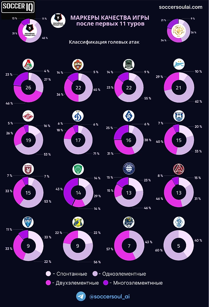 В отношении классификации голевых атак в РПЛ преобладают одноэлементные, а также выше стандартного доля спонтанных голов. Доля двухэлементных и особенно многоэлементных атак существенно ниже.