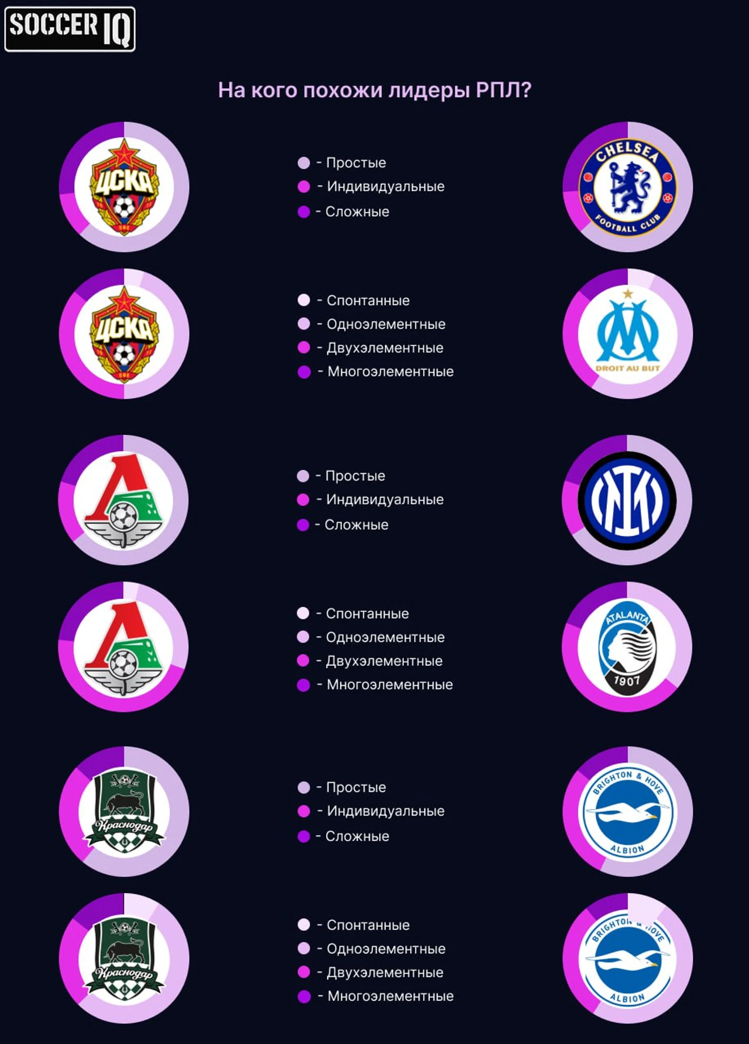 ЦСКА сочетает в себе типологию Челси и классификацию Марселя, к Локомотиву наиболее близки показатели итальянцев – Интера и Аталанты, а Краснодар по обоим параметрам имеет в качестве европейского двойника – Брайтон!