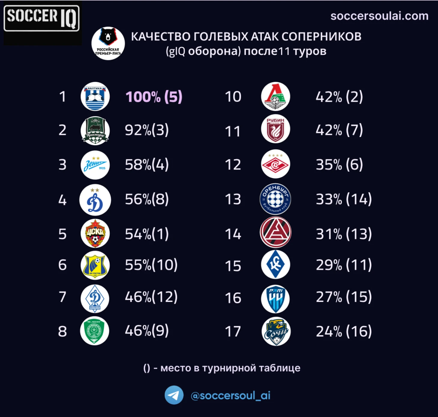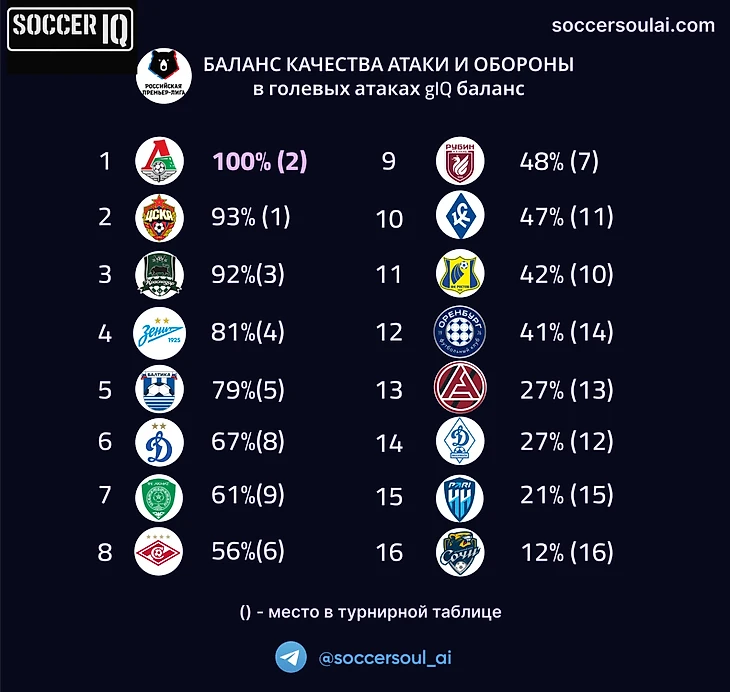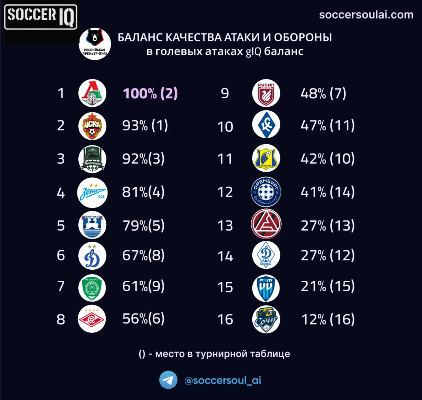 В целом gIQ баланс прекрасно отражает турнирную ситуацию. Нет ни одного расхождения с реальностью более, чем на две позиции. Приведем в пример Спартак: gIQ баланс команды соответствует 8-му месту, но реально команда делит 6-7, которому удовлетворяет только с точки зрения игры вперёд. В обороне же красно-белые ближе к Оренбургу.