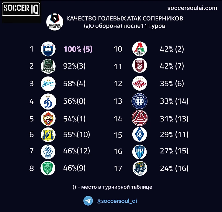 Лучший показатель оборонительных действий после 11 туров у Балтики, Андрея Талалаева, которой максимально тяжело забивать. Но, калининградцы пока середняки, с точки зрения атаки и поэтому их пятое место в таблице сбалансированности этих двух фаз соответствует реально занимаемой позиции.