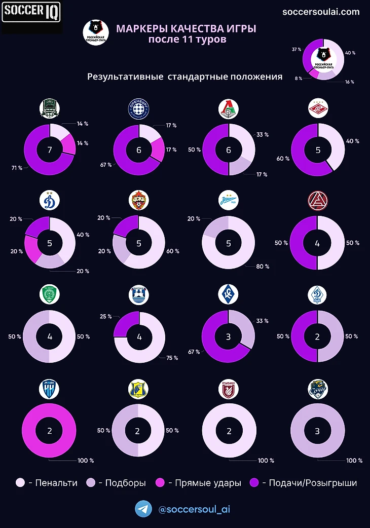 Встречаются и крайности: Пари НН забивает только прямыми ударами, Сочи – только с подборов, а Рубин – только с пенальти, но у всех этих команд общее количество «стандартных» голов невелико, в отличие от того же Зенита, который бьёт пенальти чаще всех в лиге. Команда формально имеет в активе подбор, но подбор этот также, после неудачно исполненного 11-метрового удара.