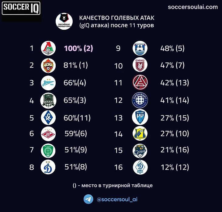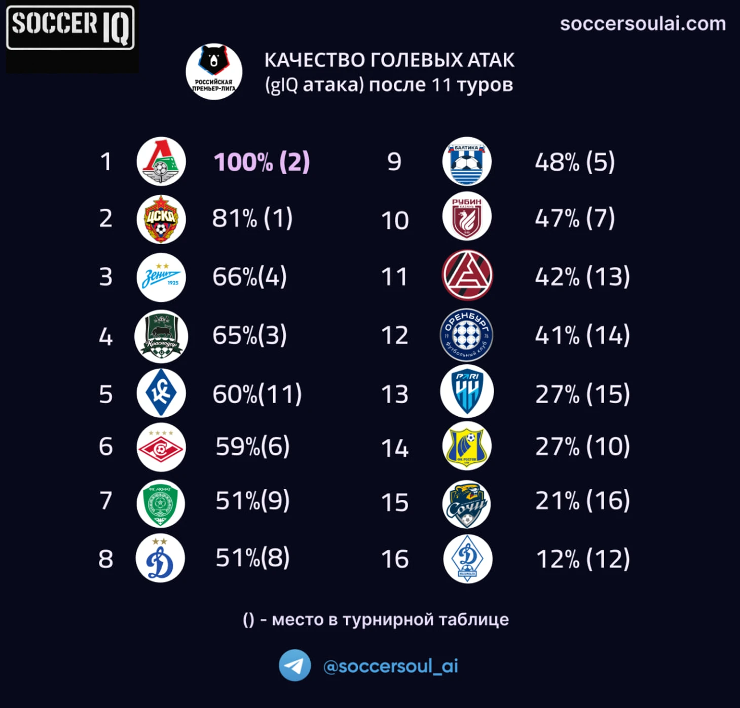 Четверка лидеров по качеству голевых атак - она же четверка лидеров чемпионата, в чуть иной расстановке. А вот пятое место Крыльев, при 11-м турнирном, говорит о том, что у команды всё неплохо впереди, но довольно печально сзади.