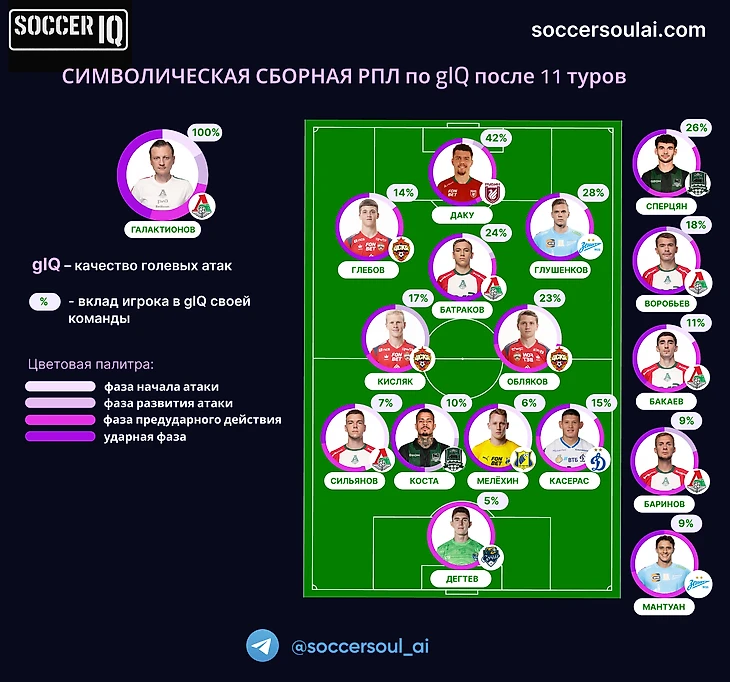 Таким образом, заметно, насколько важен с точки зрения результата для Рубина вклад Даку (42%). Атакующий результативный вклад Дегтева (Сочи) внутри своей команды (5%) стал определяющим при выборе голкипера. Вратари - не частые гости в gIQ подборках, поэтому стоит отметить и остальных представителей этого амплуа, отметившихся за 11 туров – это Шелия (Ахмат) и Песьяков (Крылья).