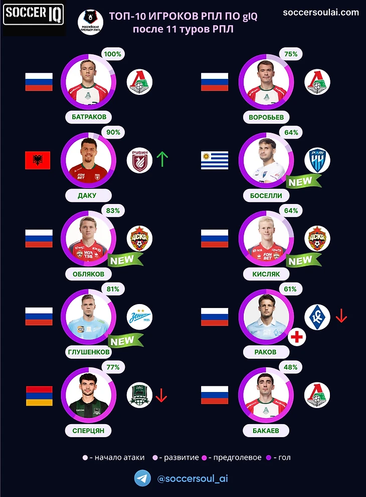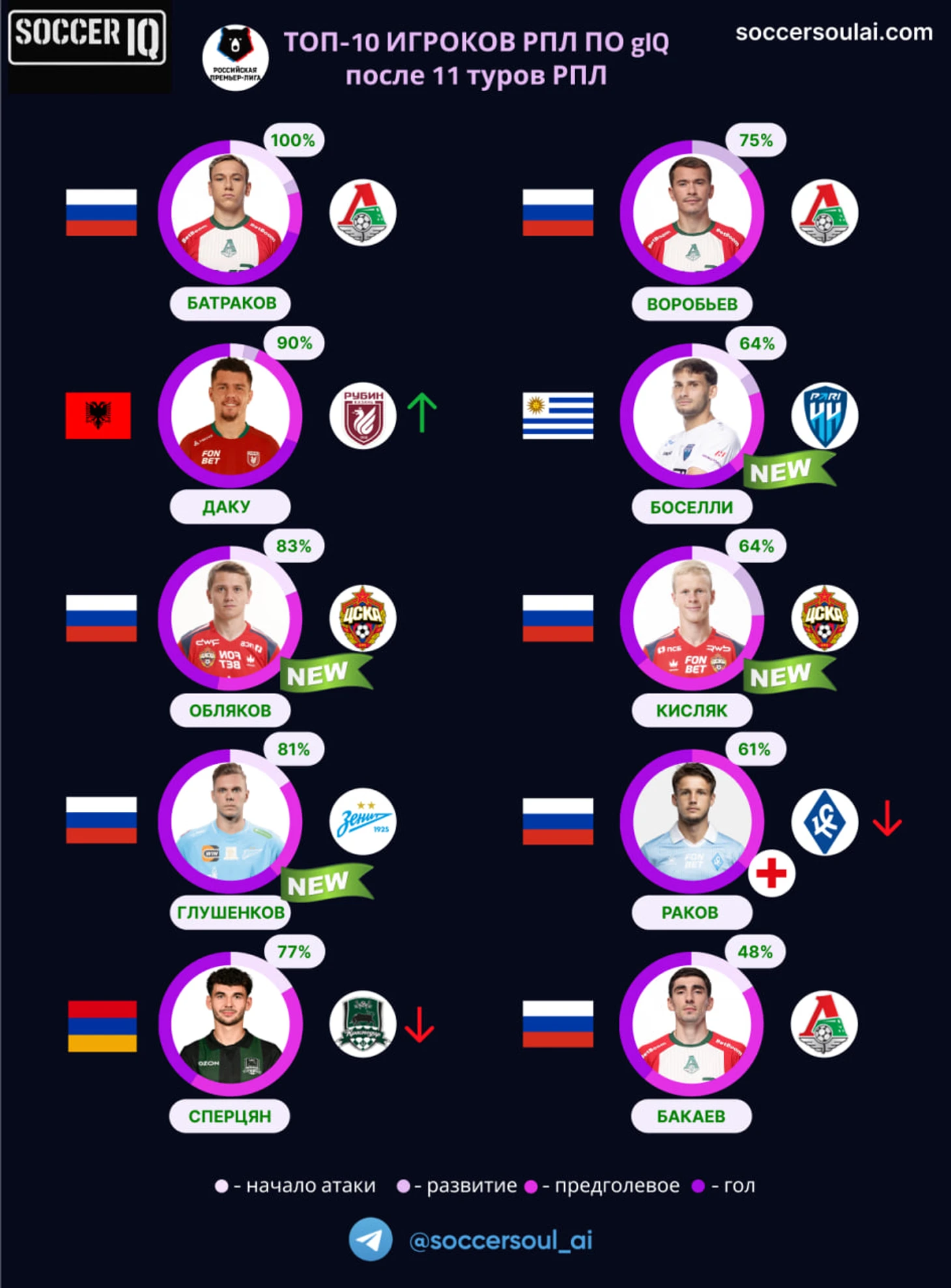 Вместо двух представителей Краснодара (из десятки выбыл Кордоба), пару представителей теперь имеет ЦСКА (причем пару дебютантов в лице Облякова и Кисляка). Впервые в ТОПе появился футболист Пари НН – Боселли (имеющий персональный вклад в командный gIQ выше 50%!). Еще одним новичком стал Глушенков (три тура подряд результативной активности с бенефисом в 10-м).
