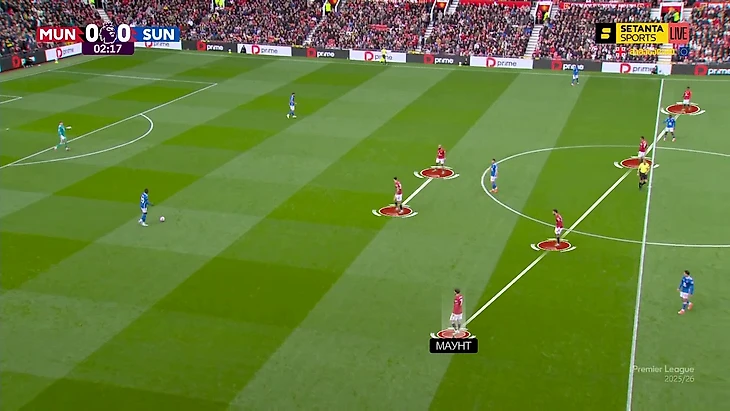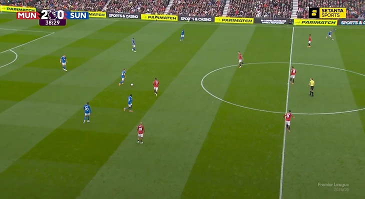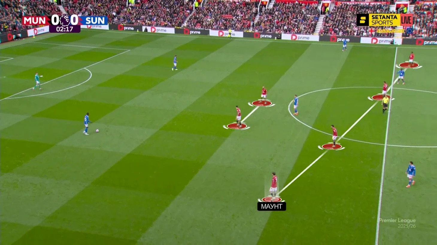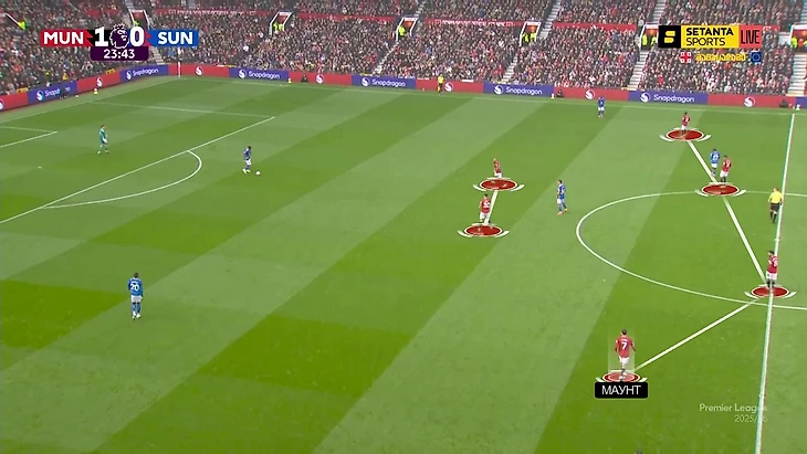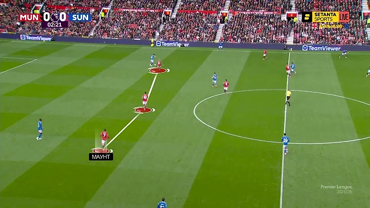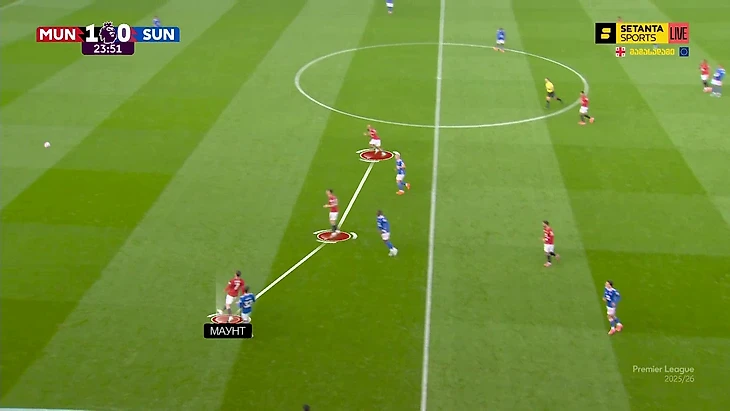 Маунт не только двигался сам, но и подсказывал партнерам. После выхода третьего ЦЗ у «Сандерленда» Аморим вернулся к хаотичному пятиугольнику в прессинге – отзеркалил соперника, который отзеркалил «МЮ». Но с нюансом: Маунт все равно заряжал давление, иногда оказываясь центрфорвардом – при живом Шешко.
