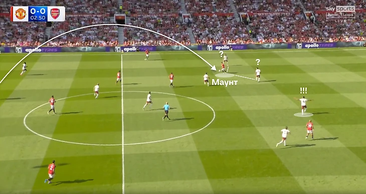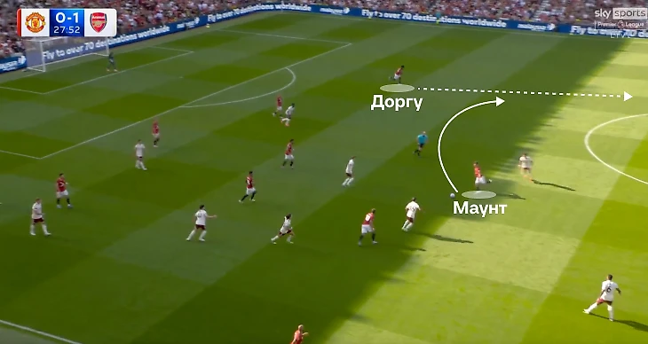 ● Тонко чувствует схему и играет почти вслепую. «МЮ» стянул «Арсенал» на фланг и создал изоляцию для Патрика Доргу. Самое сложное – перевести игру на противоположный край. Маунт справляется – не глядя делает пас в зону Доргу, потому что понимает, что вингбек там точно есть.