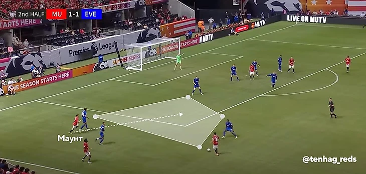 1. Маунт мастерски находит пространство в штрафной. Вот пример из предсезонной игры с «Эвертоном». Соперник безобразно расположился при вбрасывании, Мэйс за секунды оценил эпизод и рванул полукругом сквозь защитников в слепую зону. Еще во время движения Маунт развернул корпус – так при приеме появилось пространство для маневра в обе стороны.