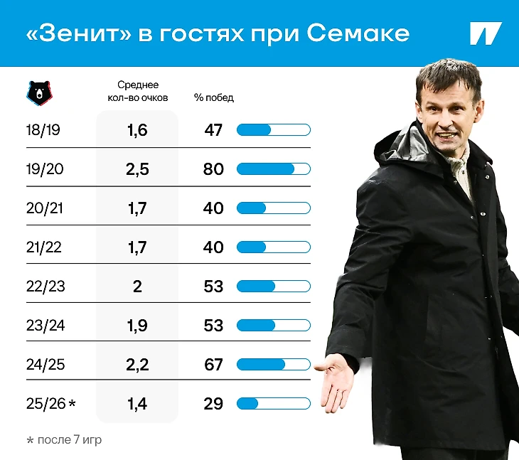 Сейчас у «Зенита» две победы в семи играх и 10 очков. С Семаком пока это первый сезон, где возникают такие сложности с игрой в гостях. Вот какая ситуация сейчас в сравнении с предыдущими.