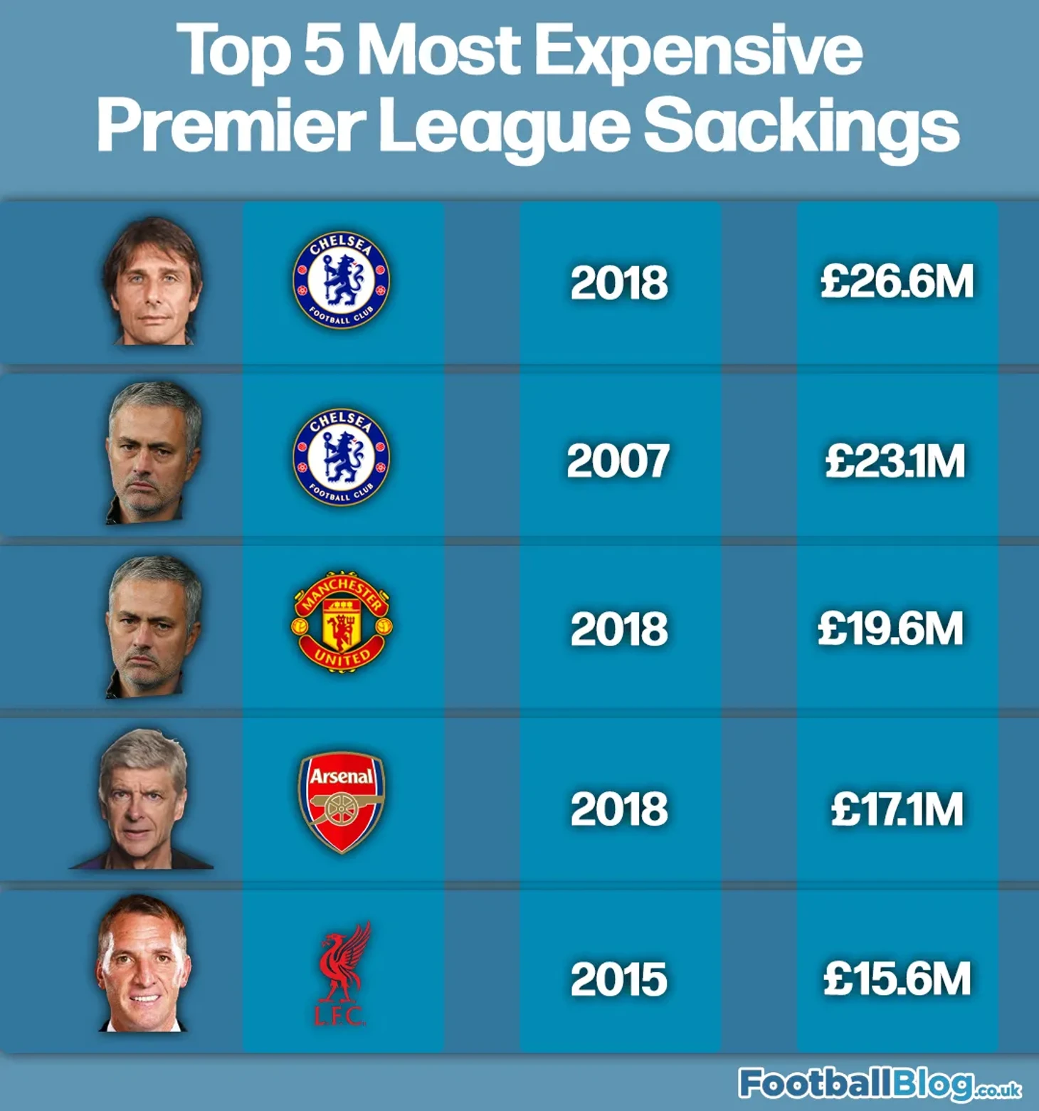 Самые дорогостоящие уходы? Антонио Конте в 2018-м убрали из «Челси» за дикие 26,6 млн фунтов. Но если учитывать инфляцию, то в 23,1 млн Жозе Моуринью из 2007-го явно перебьют их.