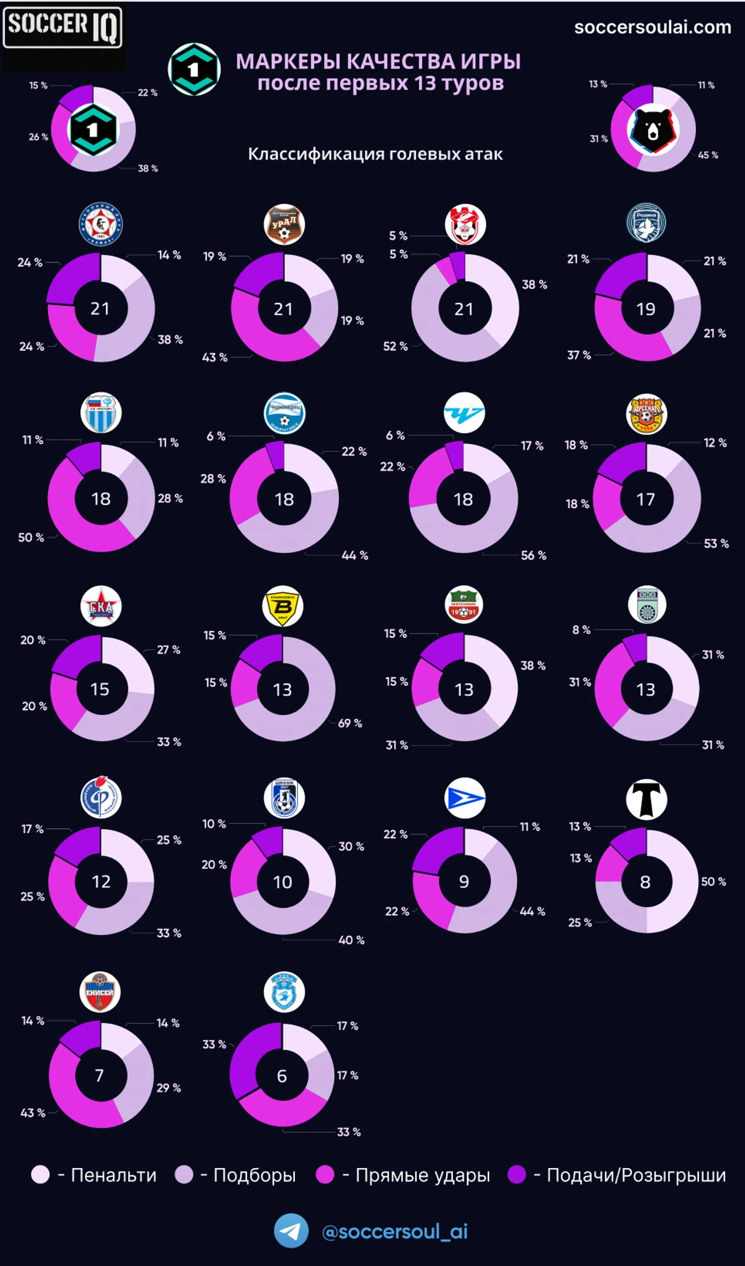 Нас в первую очередь интересуют те, кто умеет действовать многоэлементно и забивать многоэлементно, что является показателем эффективности командных действий, позволяющих вскрывать оборонительные построения соперников коллективно, а не за счет внезапно открывшихся чакр отдельных, технически одарённых футболистов или ошибок защитников! И здесь в обойме наиболее интересных команд имеются: КамАЗ – 5 (24%), Урал – 4 (19%) и Родина - 4 (21%).