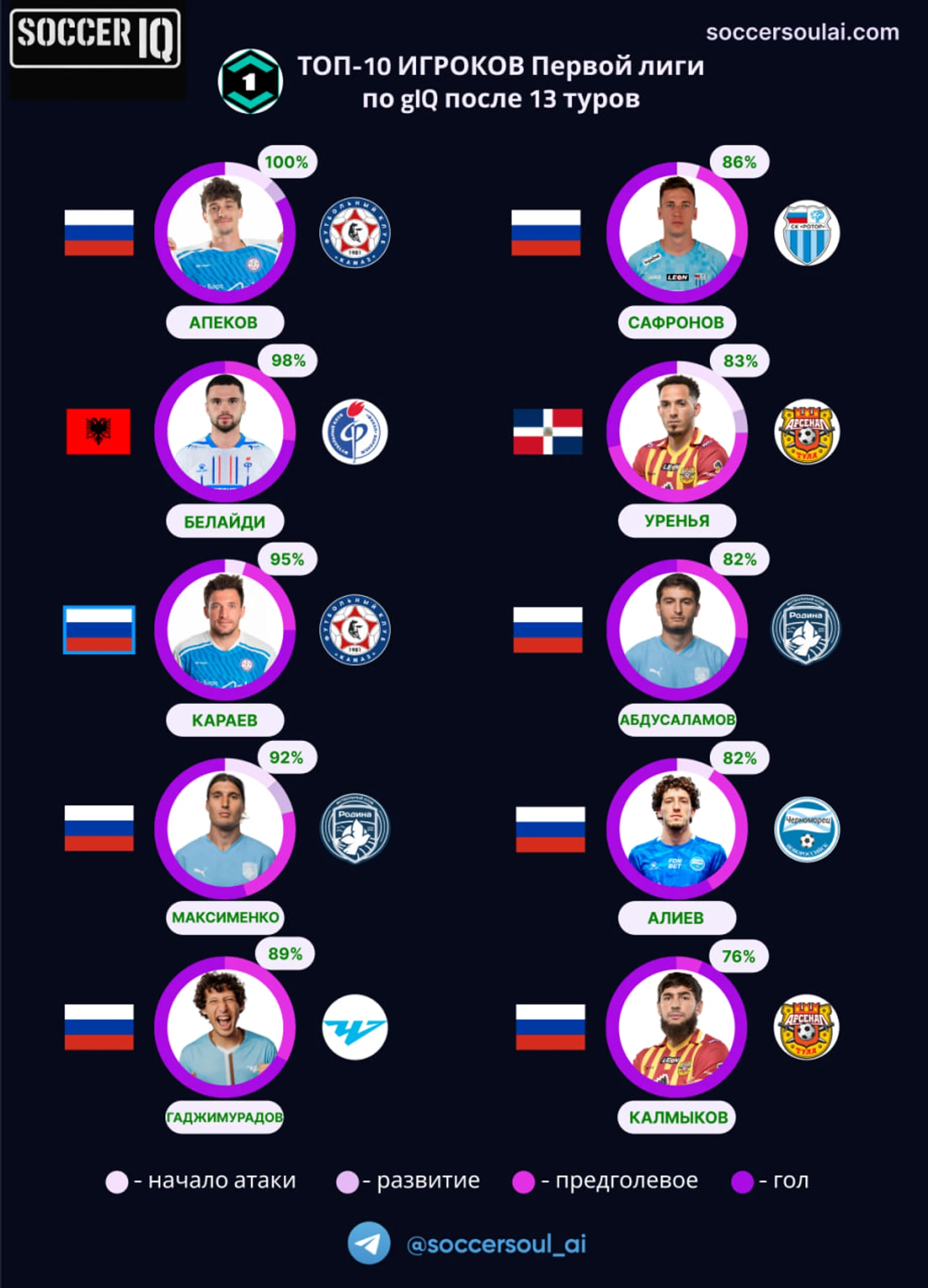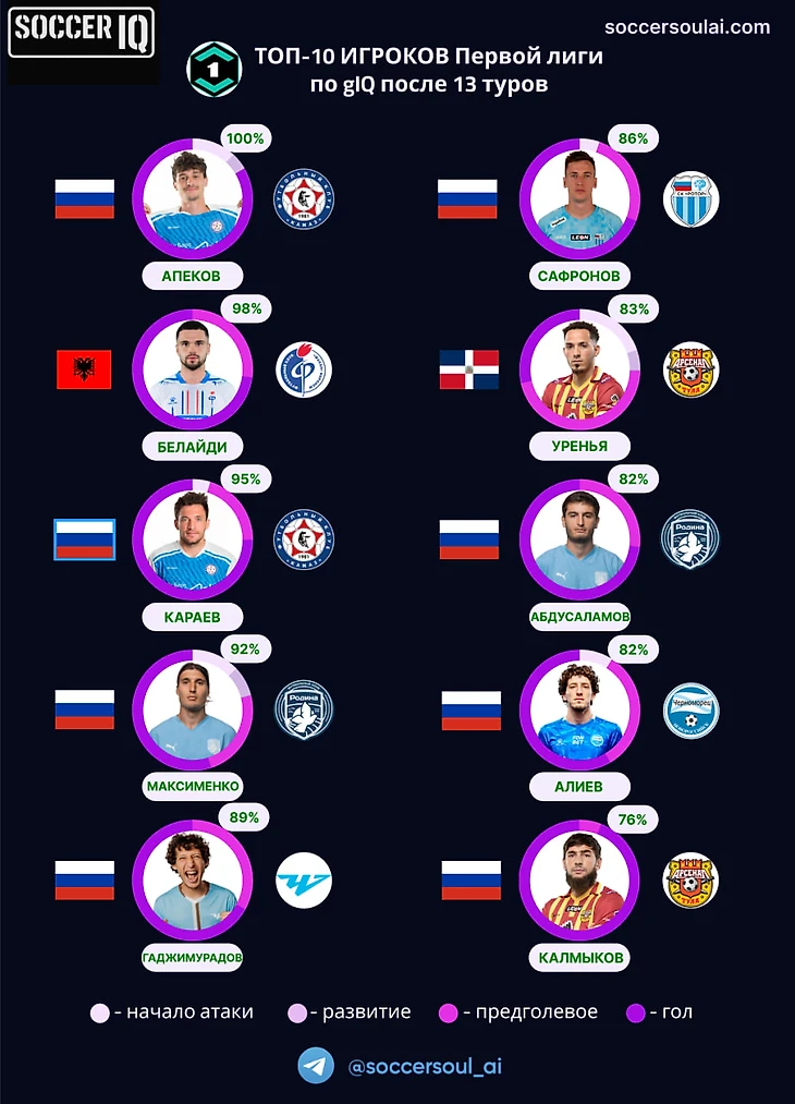Замыкает ТОП-10 Амур Калмыков – игрок, имеющий в подборке наибольшую долю gIQ в фазе завершения (94%, что отображает цветовая гамма по окружности). Наибольшая доля предголевых действий (голевая передача или предударный финт) на счету Уреньи (46%). Он же – лучший с точки зрения доли начала голевых атак (20%)!