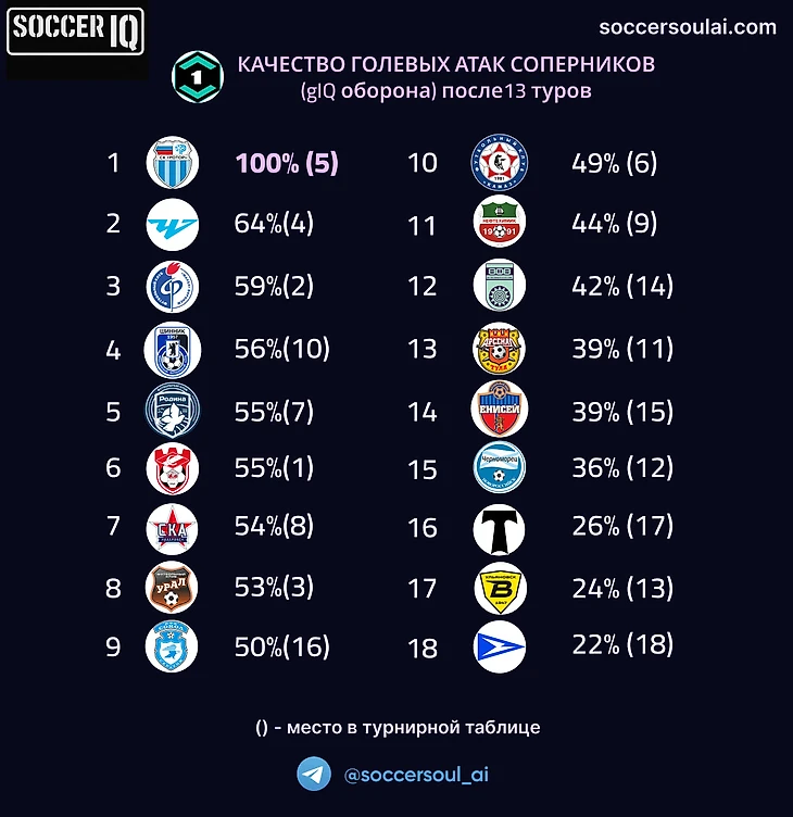 В отличие от РПЛ, четверка лидеров Первой лиги по качеству голевых атак совсем не бьётся с четверкой лидеров чемпионата. Только лидирующий по метрике gIQ атаки Урал, попадал в ТОП-4 турнирной таблицы на момент окончания 13-го тура, а фактический лидер турнира – Спартак Кострома по качеству атаки только пятый в лиге. Но, это еще не самый сильный диссонанс – идущий вторым Факел по gIQ атаки только 11-й!