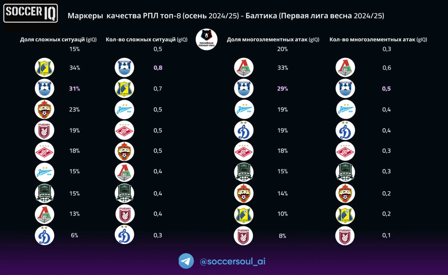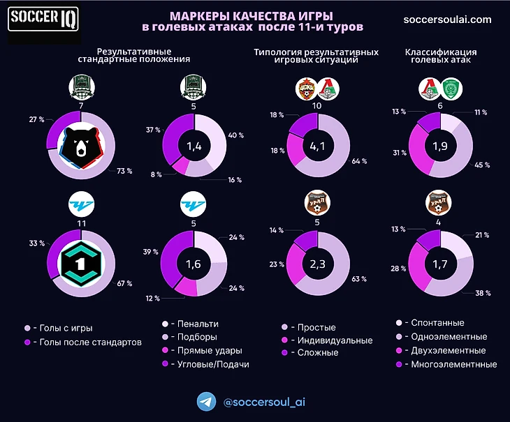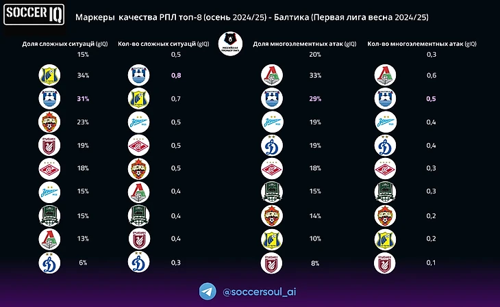 Был Ростов Карпина, с ярко-выраженно работающими сложными ситуациями, был (и остаётся) Локомотив Галактионова – великолепный пример работающей многоэлементности, (в этом сезоне серьезно подтянувшшая и «сложные») – Балтика универсально смотрелась в ТОПе по обеим метрикам!
