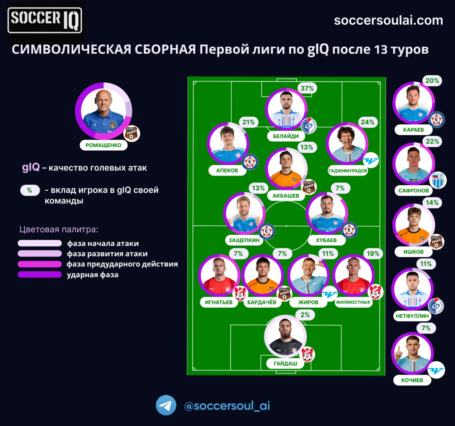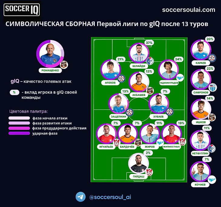 Обратите внимание, что только 3 игрока из 16, которые попали в символическую команду, начинали, развивали голевые атаки, совершали предударное действие и забивали (то есть отметились во всех фазах) — это Защепкин и два представителя Урала Акбашев и Ишков.