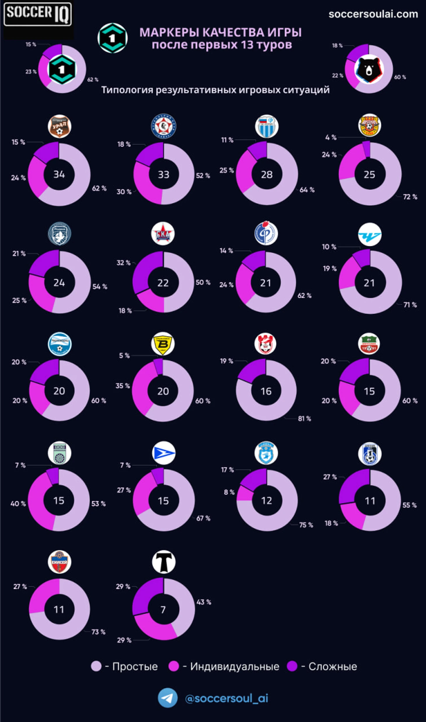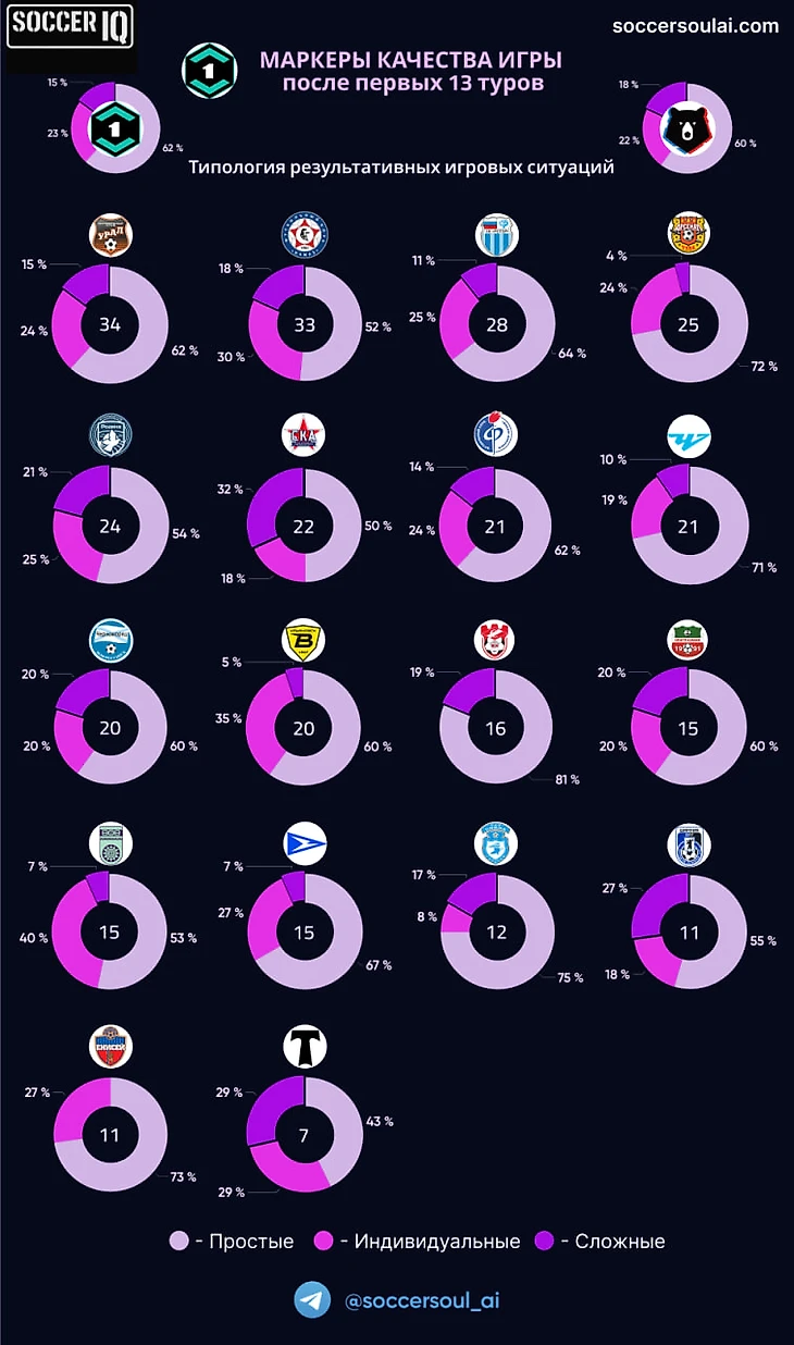 В части типологии голевых ситуаций, общий показатель Первой лиги очень близок к распределению РПЛ: несколько меньше доля сложных, в пользу простых и индивидуальных.
