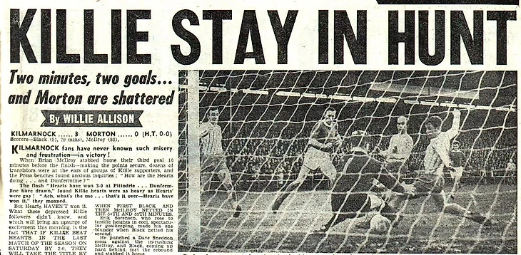Слова Уодделла стали пророческими: уже на 27-й минуте Дэвид Снеддон открыл счет, пробив головой с рикошетом от штанги после подачи Томми Маклина. Хозяева занервничали, а «Килли» продолжили идти ва-банк: спустя еще пару минут Снеддон делает пас на Берти Блэка к линии аута, последний разворачивается, выбивая мяч вперед на Брайана Макилроя, а последний наносит разящий удар низом, отправляя «Килмарнок» на вершину турнирной таблицы!