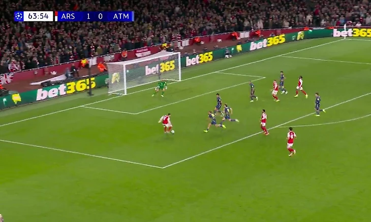 После пропущенного гола игроки «Атлетико» ненадолго встрепенулись, попытались создать «Арсеналу» проблемы, но безуспешно, счёт очень быстро удвоился. Льюис-Скелли в быстрой атаке протащил мяч к штрафной, отдал на Мартинелли и бразилец нанёс красивейший обводящий удар в дальний нижний угол. Под самую штангу — без шансов для Яна Облака.
