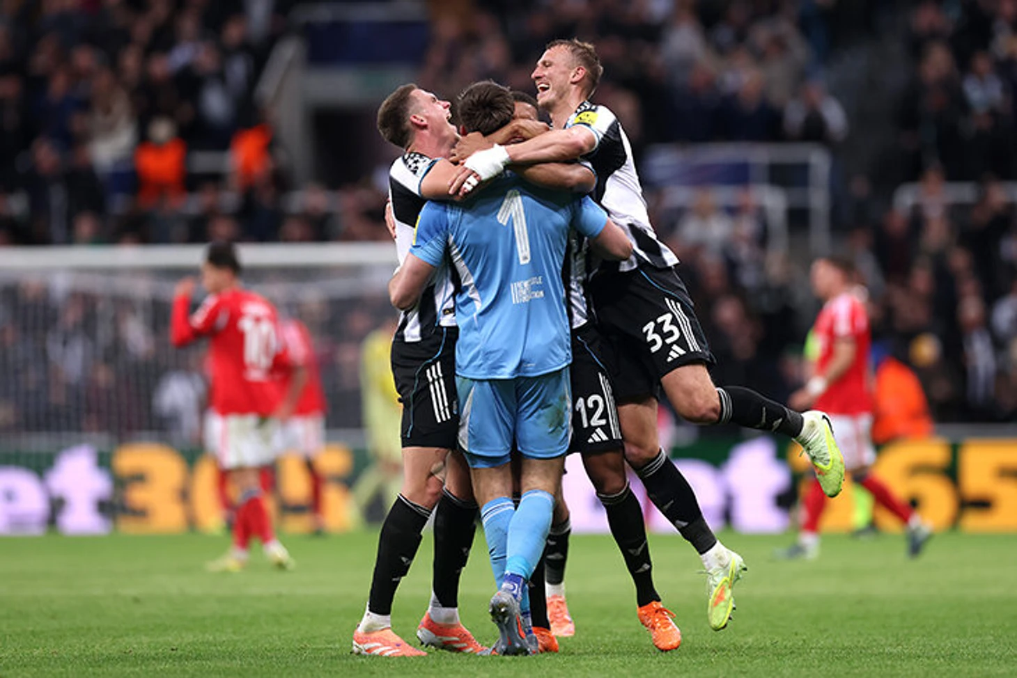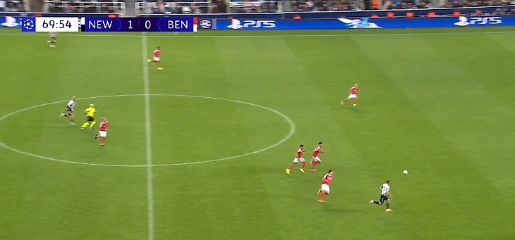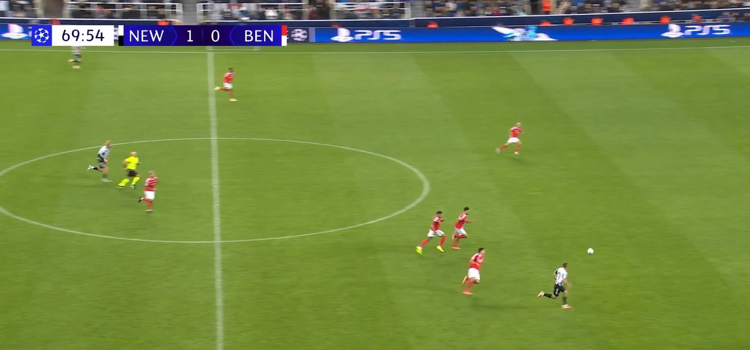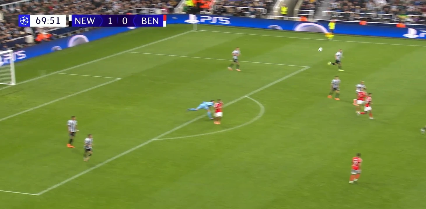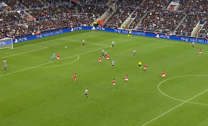 Ник Поуп из «Ньюкасла» перехватил навес, оценил ситуацию и швырнул на Харви Барнса. Да, из своей штрафной.