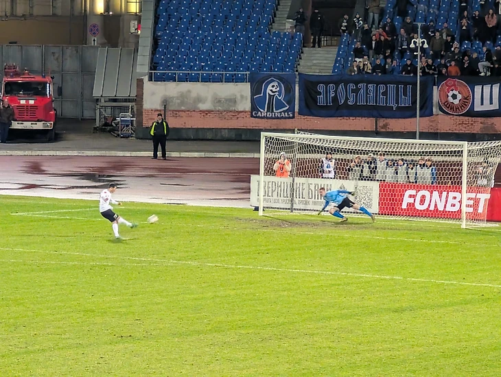 Первые три попытки команды уверенно реализовали. Тимофей Митров пару раз угадал угол, и, казалось, дотягивается до мяча, но, увы. Далее Иван Бобёр реализует свою попытку, а вот Артёму Голубеву не удалось переиграть Николая Присяжненко. Решающий пенальти реализовал Данила Сухомлинов.