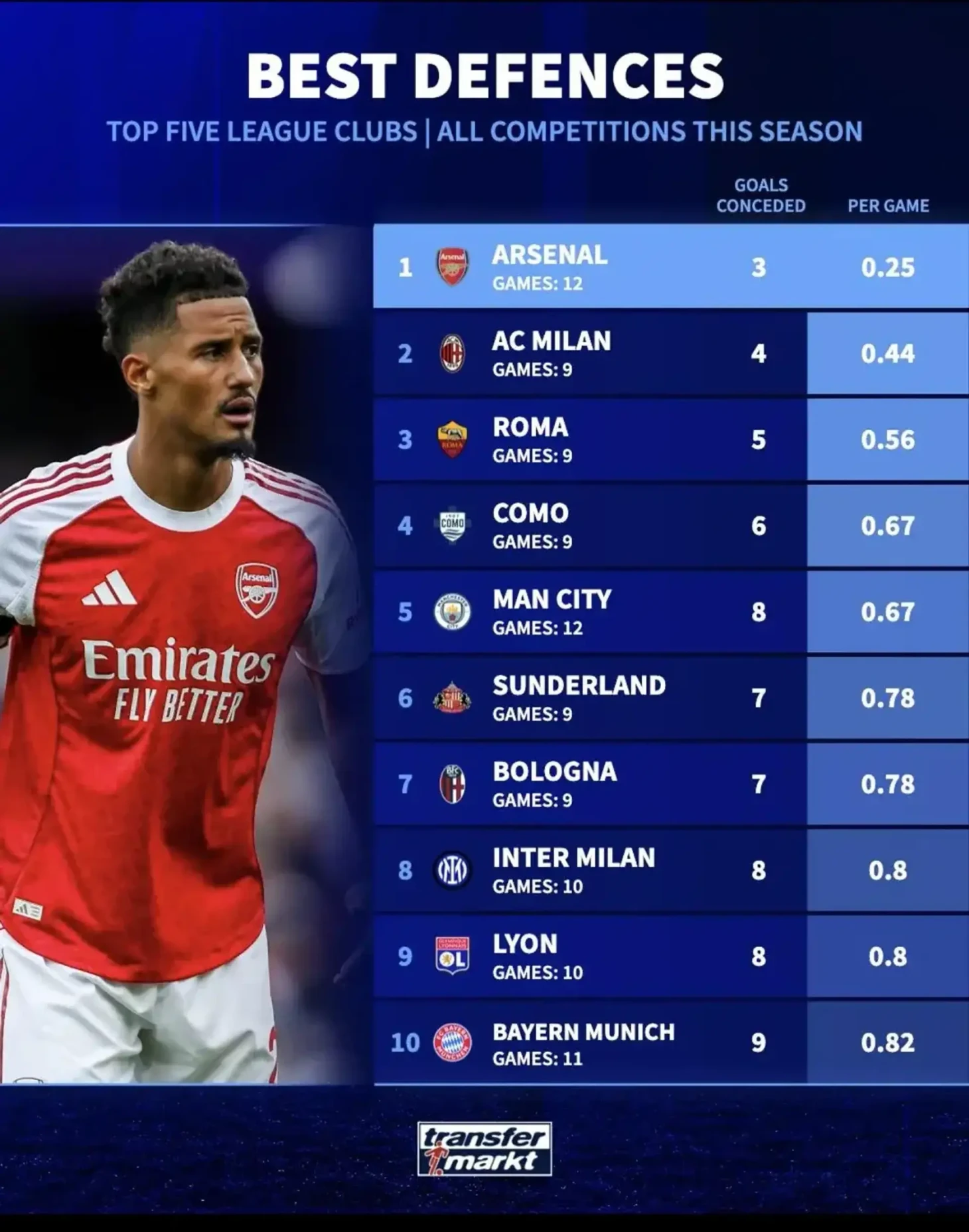 «Арсенал» проводит феноменальный сезон в обороне — команда пропустила всего 3 мяча в 12 матчах во всех турнирах. В среднем это 0,25 мяча за игру — лучший показатель среди клубов топ-5 лиг Европы.