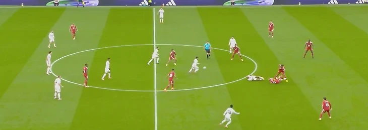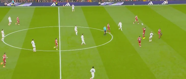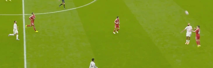 Такой невысокий процент точных передач полностью устраивал Юнайтед и позволял извлечь максимум пользы из схемы Аморима с вингбеками против 4-2-3-1 Слота. Керкез и Ван Дайк вынуждены были сваливаться в зону Мбемо и бороться с ним за верховые мячи. Бруно играл на привычной позиции, но также к нему опускался Кунья.