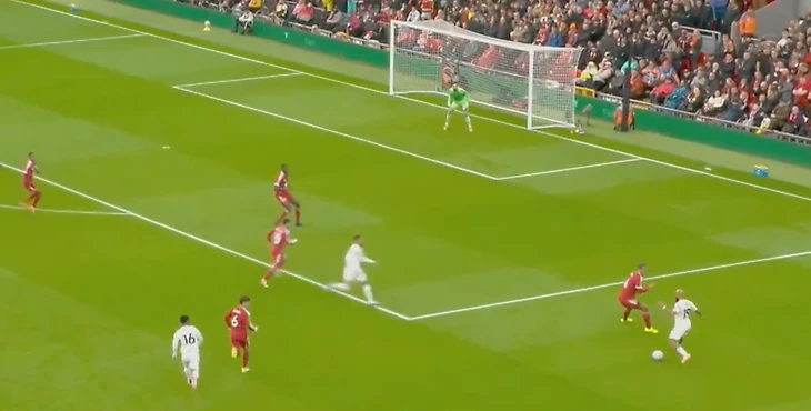 Керкеш выигрывает верховую борьбу у Мбемо, Ван Дейк возвращается назад и должен играть по Кунье. Ничего не предвещает перехода владения, а вот как этот момент разрешился в итоге: