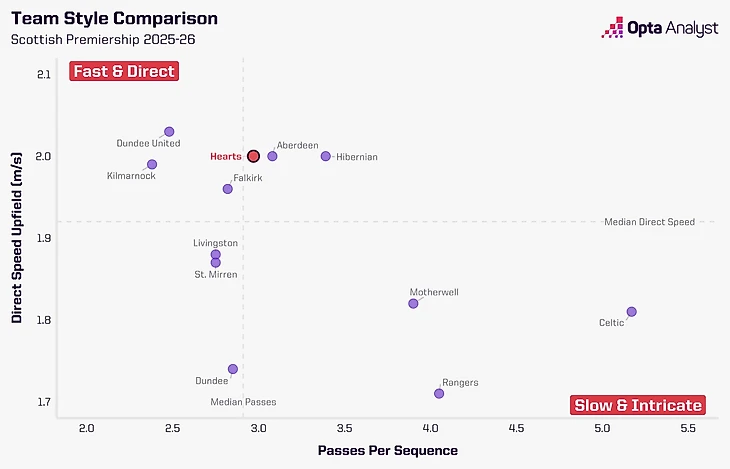 Ключевым фактором в предстоящей встрече может стать прессинг в финальной трети поля. И «Селтик» (67), и «Хартс» (61) лидируют в Премьер-лиге по отборам на чужой половине. Из 9 голов, забитых после высокого отбора в этом сезоне, треть (3) на счету «Хартс». При этом только «Хартс» (45,6 м) начинают свои атакующие комбинации в среднем выше по полю, чем «Селтик» (45,2 м).