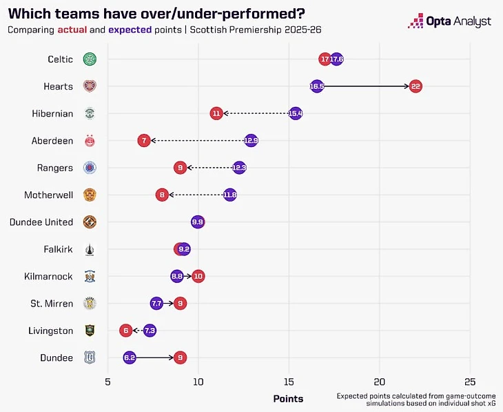 Согласно расчётной таблице ожидаемых очков Opta (основанной на показателях xG за игру), команда набрала почти на шесть очков больше, чем должна была с учётом созданных моментов. Более того, статистика указывает, что при объективном развитии событий «Хартс» могли бы сейчас находиться ниже «Селтика» в таблице.