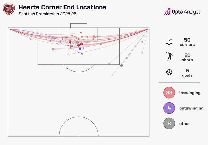 Однако сухая статистика голов не в полной мере отражает их опасность. Из 50 угловых, поданых «Хартс» в Премьер-лиге в сезоне-2025/26, 21 привёл к моментальному удару по воротам — у ближайшего конкурента всего 11. В сумме эти розыгрыши принесли 31 удар — на 9 больше, чем у любой другой команды в лиге.