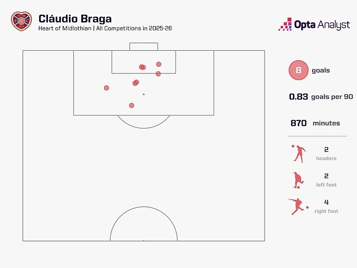 В целом атака «Хартс» выглядит самой яркой за многие годы. В среднем они наносят 15.5 ударов за игру — лучший показатель за 18 сезонов в шотландской Премьер-лиге. Их средний xG за матч (1.72) также значительно выше, чем в предыдущие четыре сезона.