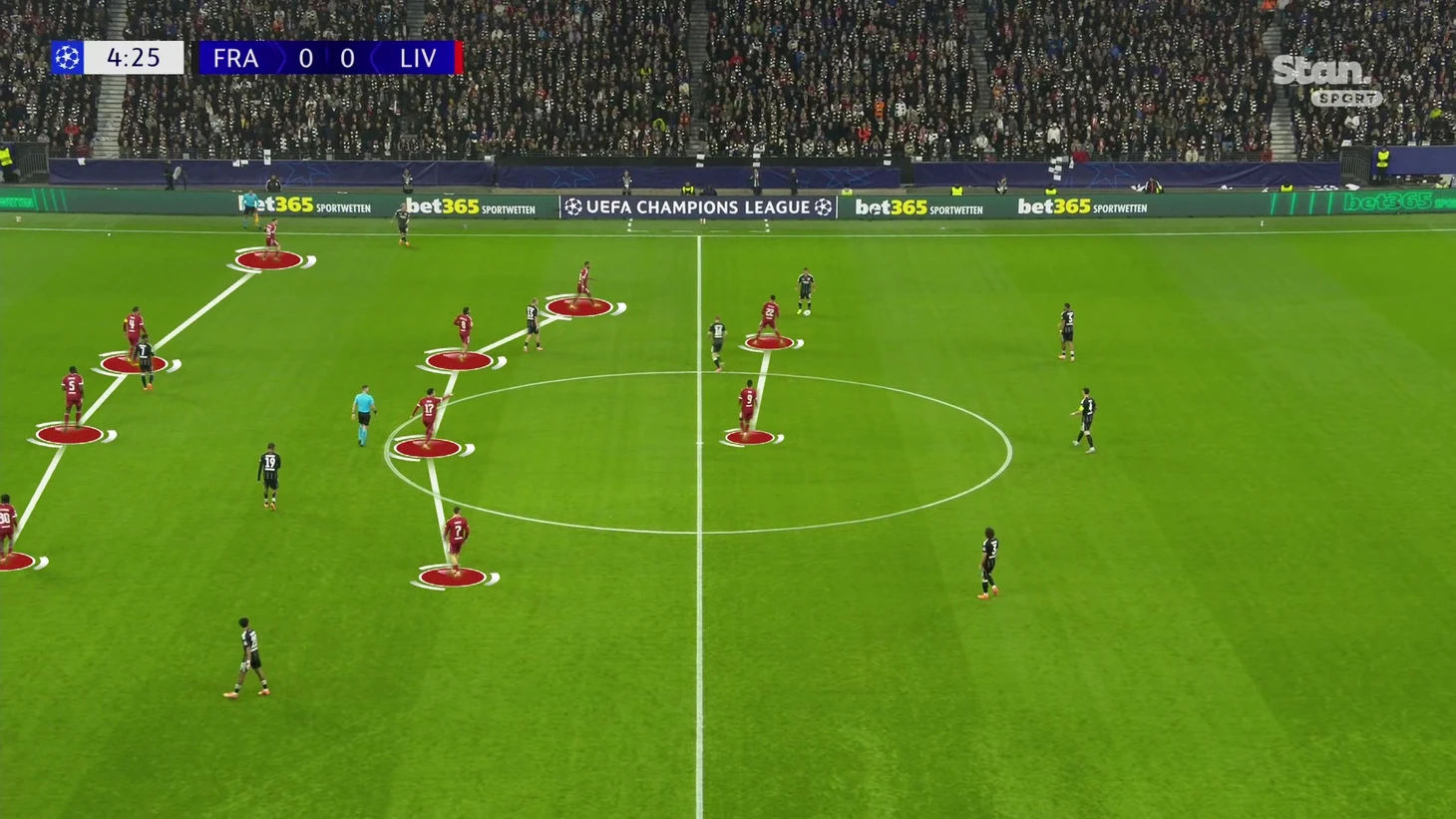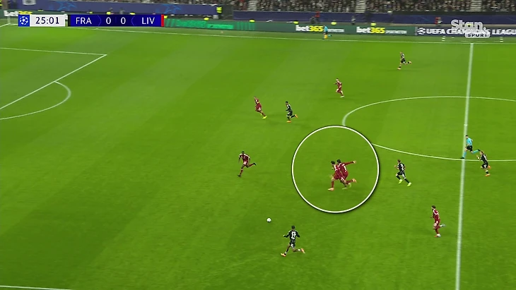 А вот без мяча сложнее. В этой стадии центр закрывали Джонс и Собослаи. Оба не профильные оборонительные игроки. Оба не приучены оценивать ситуацию в опорной и ориентируются на мяч. Из-за этого возникла комичная ситуация перед голом «Айнтрахта». Они буквально столкнулись, пока в опорной дыра, которую вскроет Гетце.