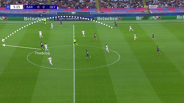 Сначала «Барселона» использовала скорость и часто искала Рэшфорда закидушками за спину. Маркус постоянно искал бреши между защитниками и был готов к передаче. Наиболее опасно получилось в начале игры, когда хозяева преодолели прессинг, и Жюль Кунде увидел движение форварда («Олимпиакос» спас своевременный выход голкипера).