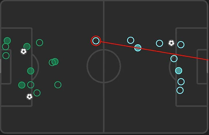 Очертания этой задумки более-менее понятны. Есть интересные элементы, которых Слот избегал ранее – справа ширину дает латераль, а не вингер; в атаке два четких форварда. Несмотря на 5:1, на практике пока выглядит сыро. В стадии развития своих атак не хватало синхронности.