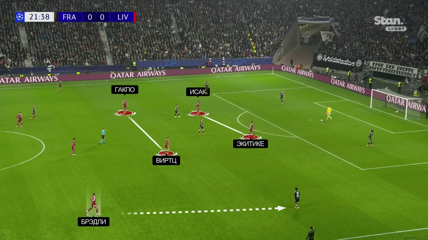 При прессинге формация переходила в 4-2-2-2 с парой форвардов и узкими позициями Виртца и Гакпо. Обязательной была готовность латералей резко поддерживать основную прессинг-группу: