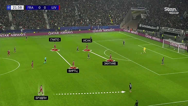 Арне Слот оставил Мо Салаха на скамейке против «Айнтрахта» (5:1). «Ливерпуль» опробовал новый вариант с парой Исак-Экитике в атаке; еще интриговал правый фланг, где изначально вышли знакомые по «Байеру» Фло Виртц и Джереми Фримпонг (увы, получил травму в первом тайме). Давайте зафиксируем новую идею «Ливерпуля».
