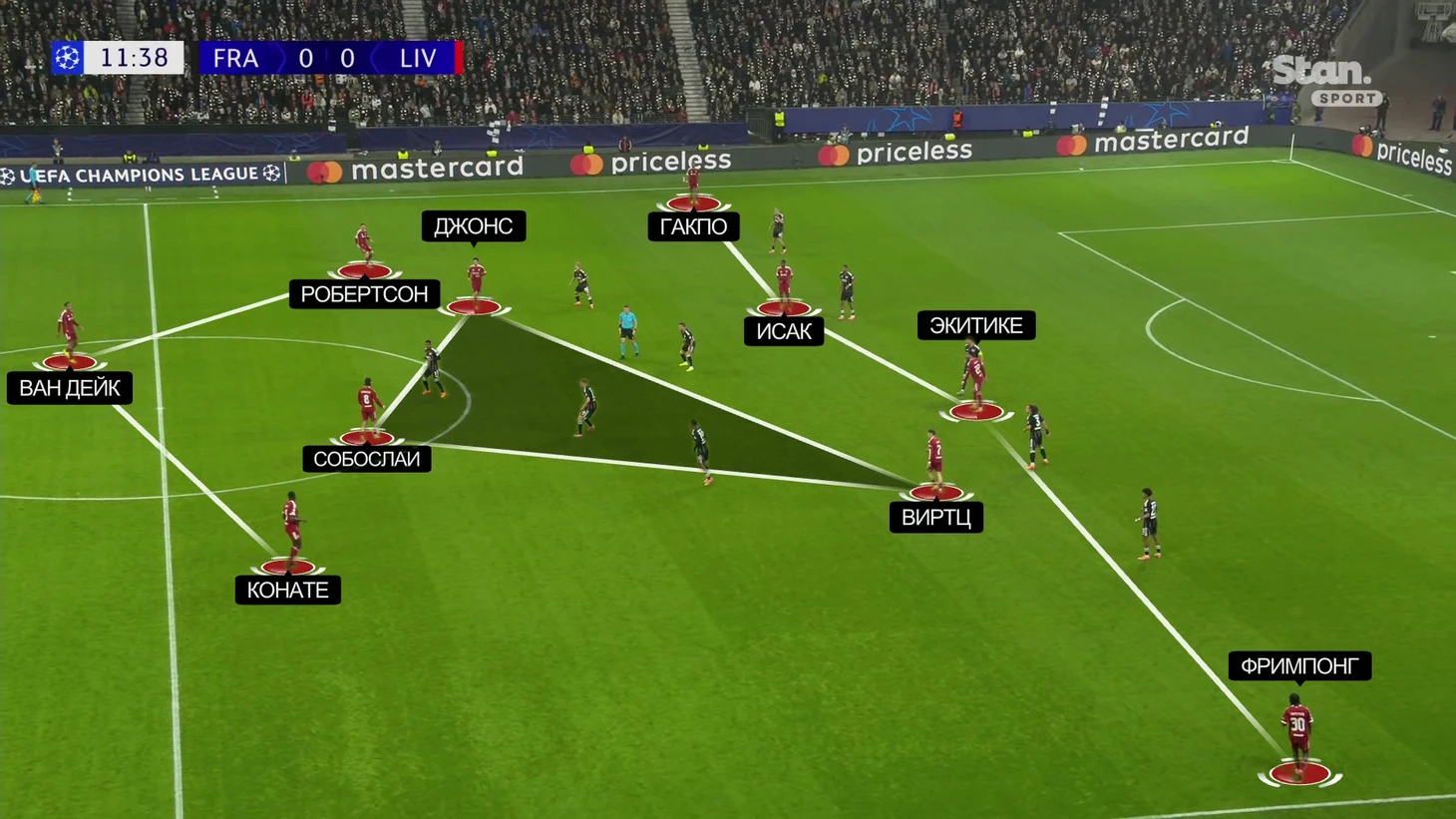 Структура с мячом – 3+1 в первой стадии. Собослаи оставался с центральными защитниками и Энди Робертсоном. Ширину давали Фримпонг и Гакпо. Виртц ожидаемо смещался в центр, Джонс свободно искал пространство, а впереди – пара нападающих: