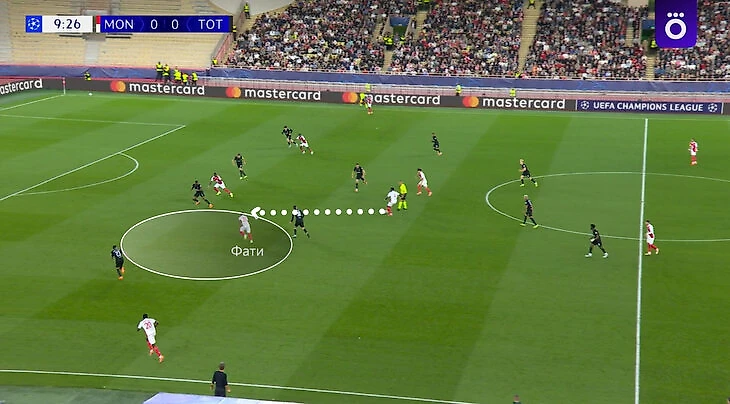 «Тоттенхэм» допустил много моментов в контратаках (не всегда успевали вовремя наладить компактность) и после передач за спину опорникам или крайним защитникам. «Монако» регулярно нагружал эти зоны и находил там пространство. На примере в одиночестве оказался Ансу Фати, выкатил под удар Магну Аклиушу.