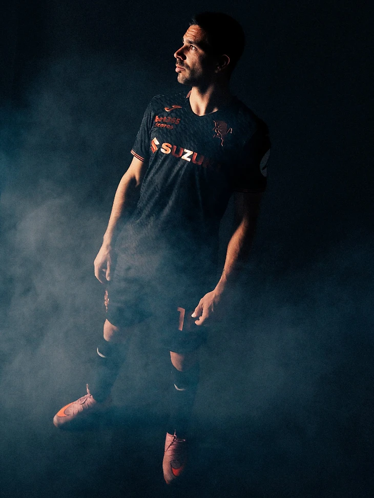 Футболка выполнена в тёмно-антрацитовом цвете с жаккардовым узором в тон ткани. На груди изображен бронзовый герб Турина, сочетающийся с логотипом Joma и деталями спонсора. Комплект будет сочетаться с тёмными шортами и носками в тон.