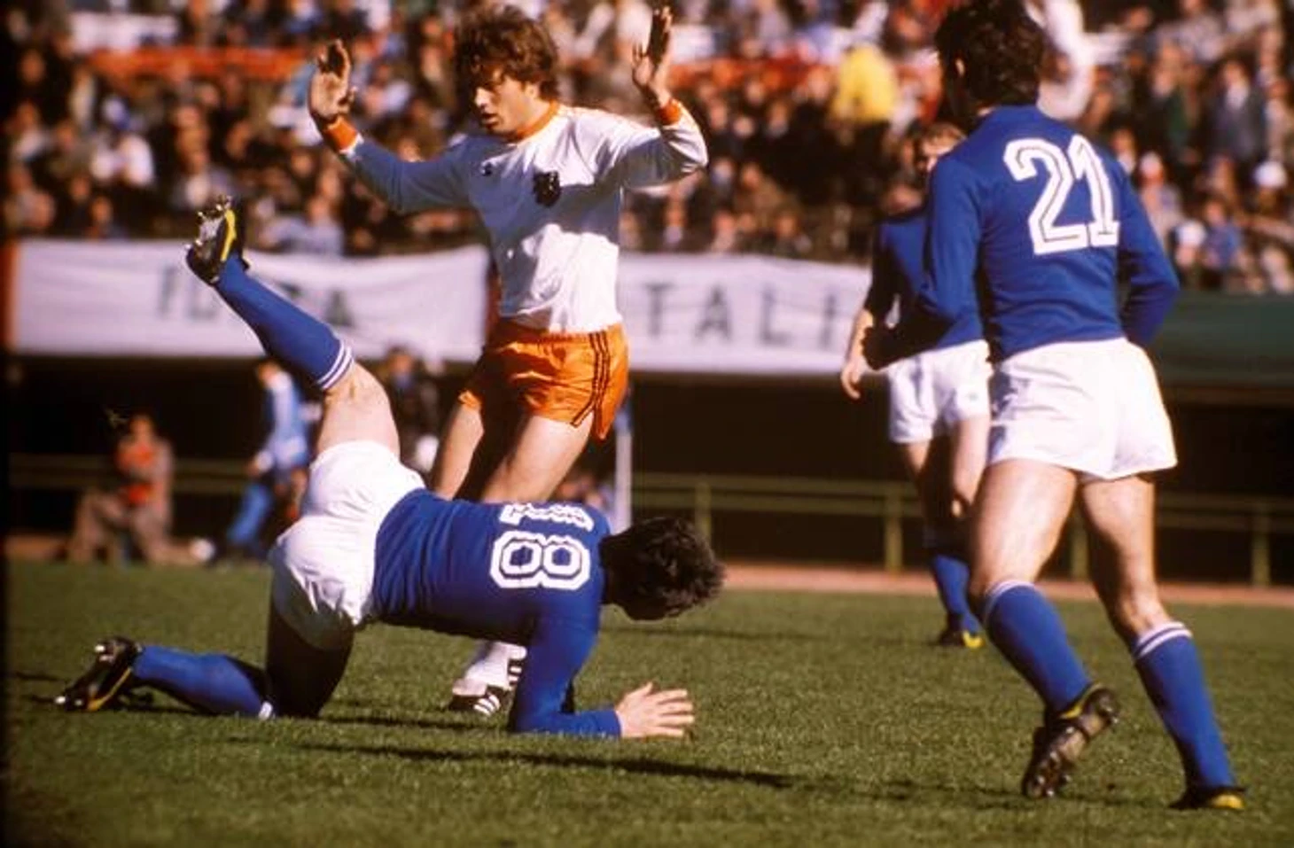 На поле выходит Клаудио Сала – отличный игрок, но по стилю совсем другой. Поймите правильно: он не виноват. Однако, как назло, вскоре после этой замены Голландия сравнивает – ударом Брандтса, а потом обгоняет: невероятный дальний выстрел Хаана. Два удара – два гола. И больше Голландия в том матче не создала ничего.