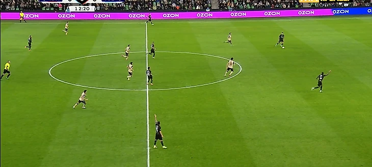 Стоит отметить, что переход между двумя вариантами осуществлялся молниеносно – особенно тут стоит похвалить игроков, которые за него отвечали (чаще всего Черников и Петров). Проблем, как обычно, не возникло в любой расстановке, но продвижение в 3+1 было крайне скудным. Ширины очень сильно не хватало. 2+4 же показали себя неплохо, что не удивительно – чем больше игроков, тем лучше. Однако мне все эти эксперименты не близки: более сбалансированные 2+3 и 3+2 по-прежнему смотрятся предпочтительнее.