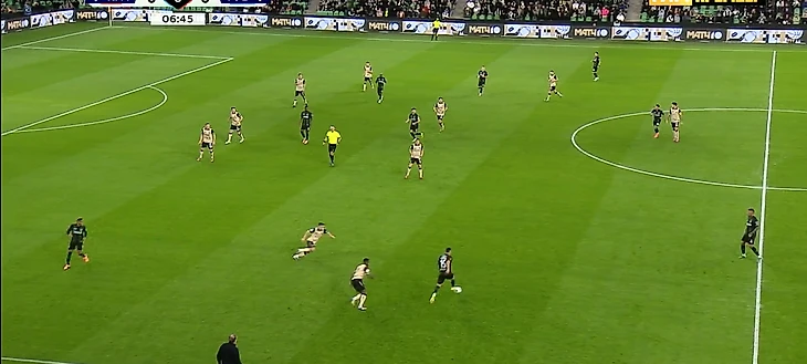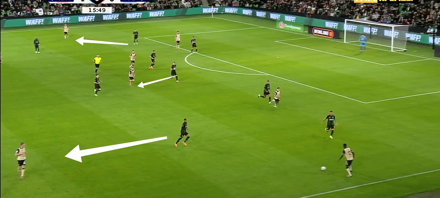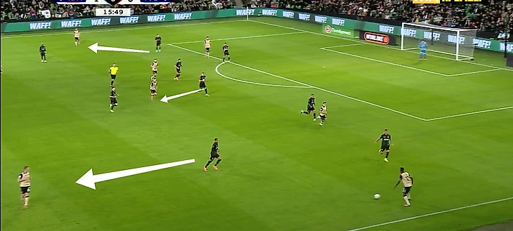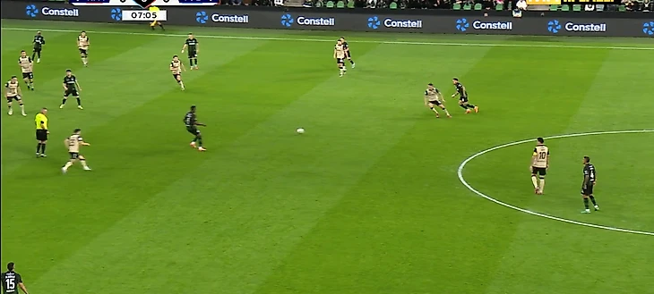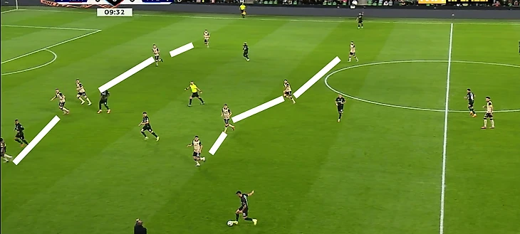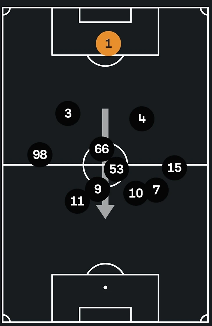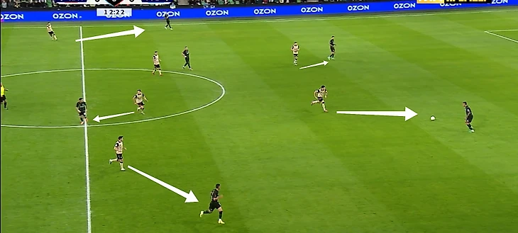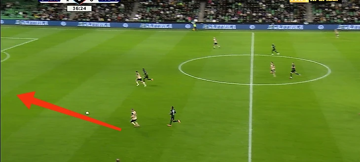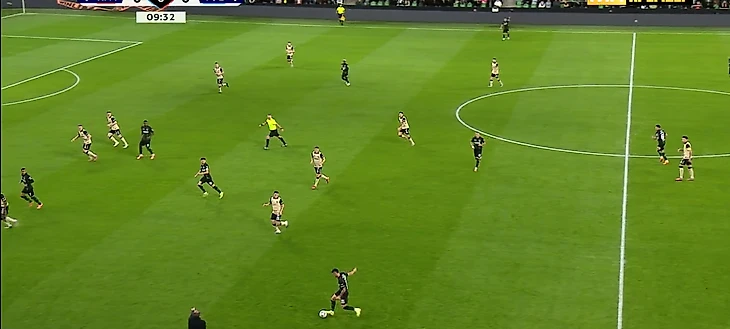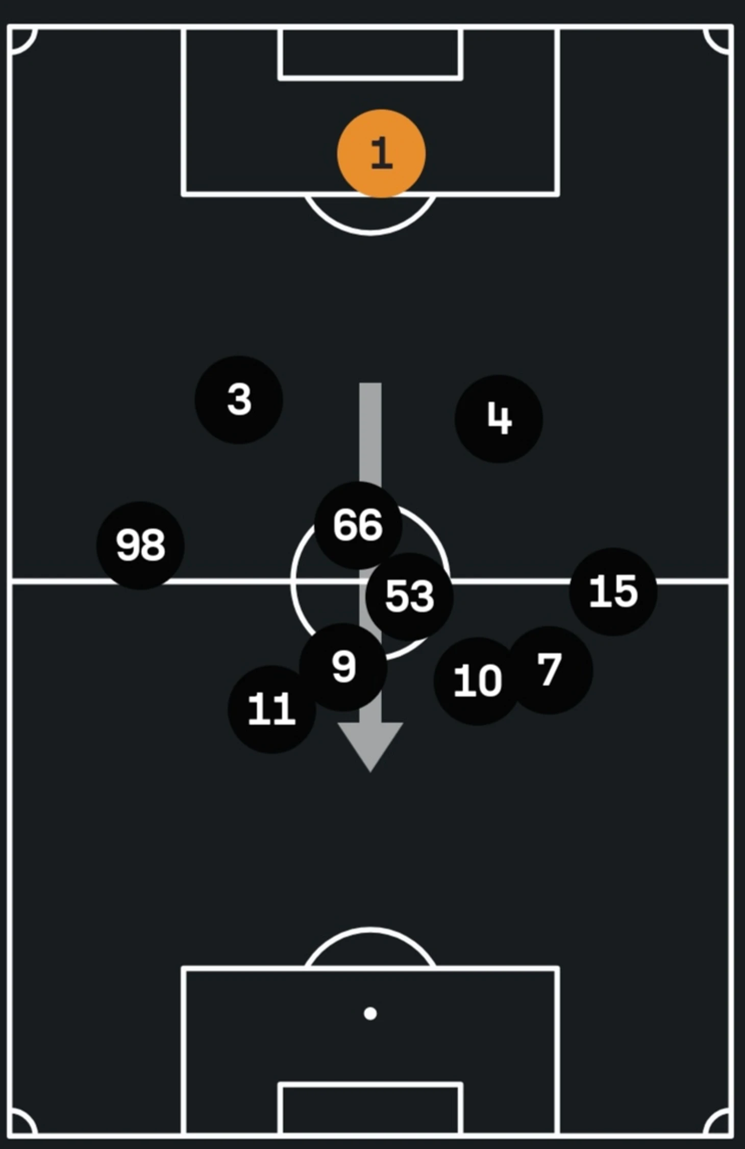 Да, финальная передача прошла не без удачи, но даже такому «удачливому» голу предшествовала длинная логическая цепочка. И финальное замечание, отмеченное на скрине выше: почему Са оказался первым на мяче без опеки? Потому что выбегал из глубины. Почему он выбегал из глубины? Опять-таки, установка играть между линий.